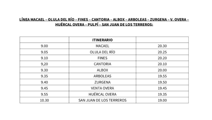 The programme establishes a new service that connects Macael, Olula Del Río, Fines, Albox, Arboleas, Zurgena and Huércal Overa with Pulpí, reaching San Juan de los Terreros. Through this programme, a round trip will be carried out on Sundays and holidays at the following times: